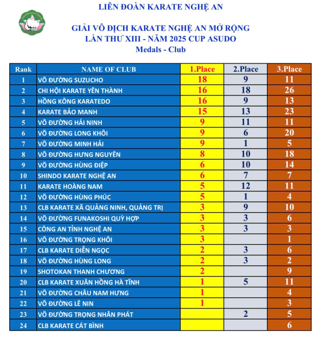 Sau hai ngày thi đấu hết mình với sự tham dự của 24 CLB và 568 VĐV được điều hành bởi 50 trọng tài cấp Quốc gia và Nghệ An, Giải Vô địch Karate Nghệ An lần thứ XIII năm 2025 tranh Cup Asudo đã kết thúc thành công tốt đẹp.
