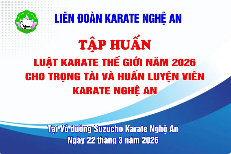 Khóa tập huấn Luật thi đấu Karate mới năm 2026 do Liên đoàn Karate tỉnh Nghệ An tổ chức. Sự kiện diễn ra từ ngày 21-22/03/2026 tại Nghệ An, nhằm cập nhật luật thi đấu mới nhất của Liên đoàn Karate Thế giới năm 2026 cho trọng tài và huấn luyện viên.